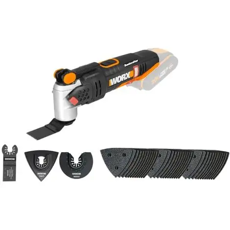 L’outil multifonction Worx WX693.9 Bare Tool 20V dispose d’un système de montage «hyperlock». Ce système de montage vous permet de changer d’accessoires sans effort et rapidement pour un changement d’accessoires sans effort et rapide sans outils. Un gros avantage de l’outil multifonction est que vous pouvez monter les lames de scie dans différentes positions sur la machine. De cette façon, vous pouvez atteindre tous les endroits difficiles que vous ne pourriez jamais atteindre avec une scie circulaire normale.La fonction LED de l’outil multifonction Worx éclaire également tout lieu de travail sombre. De plus, l’outil multifonction a un réglage de vitesse variable, vous pouvez donc ajuster la vitesse de l’outil à votre guise. Cet outil est multifonctionnel et peut être utilisé pour couper, scier, raboter, poncer et bien plus encore. Cet outil multifonction peut être utilisé sur toutes sortes de matériaux: comme le bois, le métal, les carrelage, les plaques de plâtre et la maçonnerie. L’outil multifonction est fourni avec des accessoires. Vous recevrez une lame de scie pour la scie circulaire, une lame de scie universelle de 28 mm, une feuille de ponçage, 12 papiers abrasifs de 40K (granulométrie), 12 papiers abrasifs de 80K et 12 papiers abrasifs de 120K.