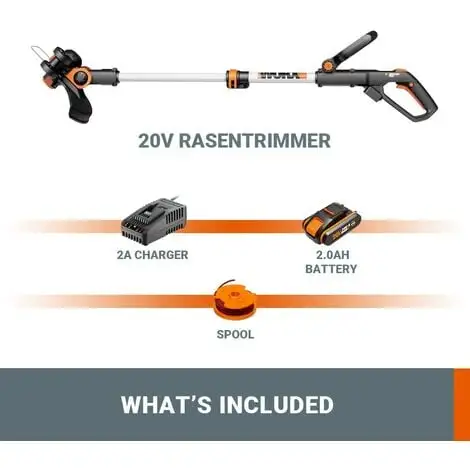 - Emballage Inclut Le coupe-bordures sans fil est livré avec batterie WA3551 20V 2,0Ah, un 1h chargeur rapide WA3880 et une bobine.